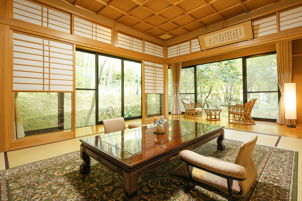 We have a detached room full of the taste with bath in its room and open-air bath flowing constantly from the source which was loved by various celebrities. The detached Buildings along the Amori River is so bright so as to feel that it arrives if I stretch out a hand. On bamboo forest surrounding facilities and a route to climb the mountain behind from there, another world letting you forget that it is near of the sphere of life spreads. The two-story wooden main building which is the center of the Orihashi Ryokan is a wooden building full of romance from the Taisho era that was relocated after overcoming flood damage.